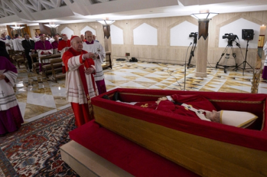 coffin Vatican releases first images of Pope Francis lying in state at Casa Santa Marta The Vatican on Tuesday released the first official photographs of Pope Francis lying in an open coffin inside the chapel...