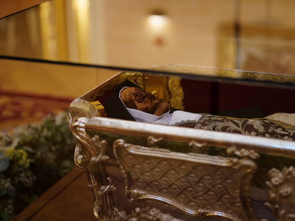 What is visible is a skull dressed in a habit with vestments covering other parts of the body, not all of which is intact. The saint’s heart is kept in another part of the church, officials said. Other body parts are kept as relics — fingers, a hand and a jaw — in churches across Europe.