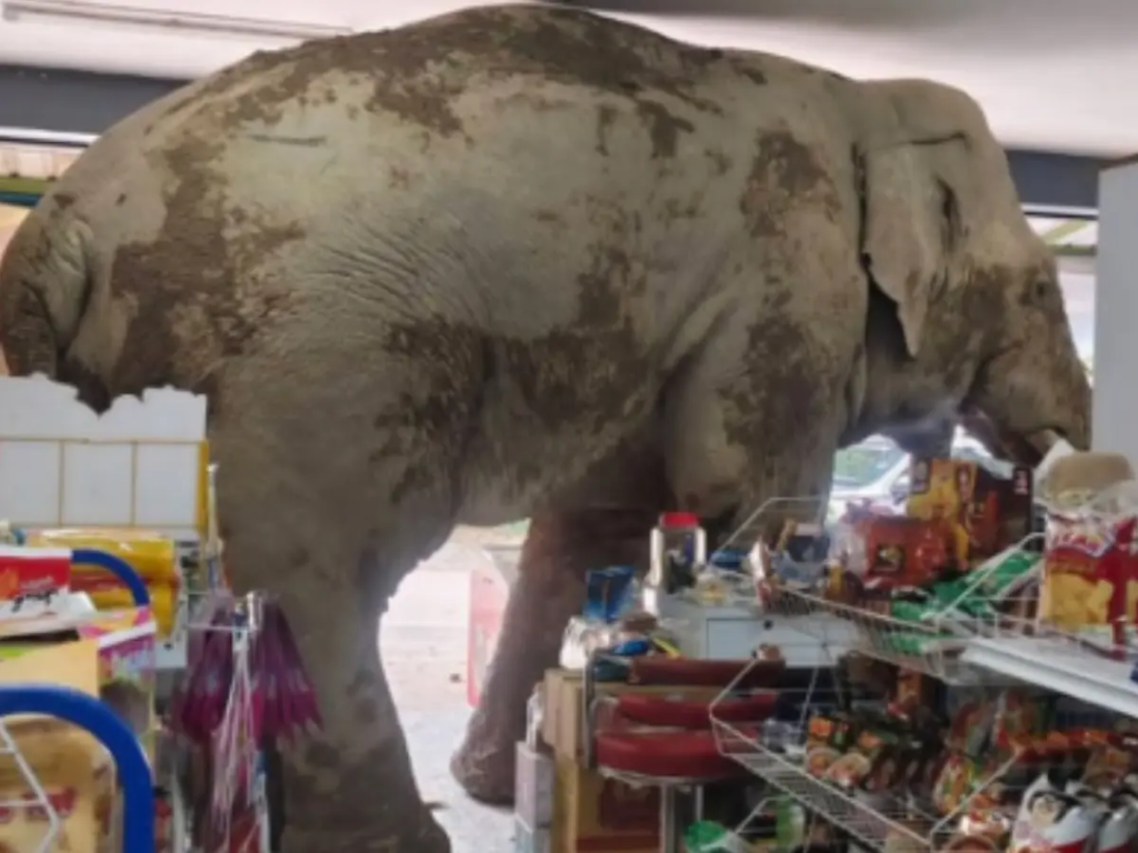 Eyewitnesses described the scene as chaotic yet oddly calm. Surveillance footage shows the elephant towering over the aisles, toppling shelves with ease, and sniffing out snacks. Eventually, he settles on a packet of rice crackers before casually making his way out, leaving a trail of damage — but thankfully no injuries.