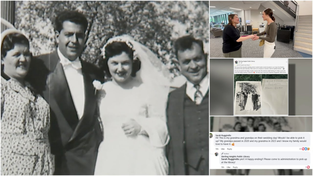 The Sterling Heights Public Library announced that a black-and-white wedding photo labeled “Frank and Josephine Ruggirello, Nana-Nono” was found inside a book donated to its Used, But Sterling bookstore. Staff members turned to Facebook in an effort to locate the family, and it worked.