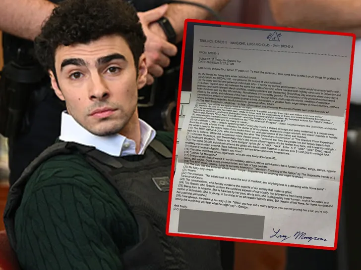 Luigi Mangione, the man charged with murdering UnitedHealthcare CEO Brian Thompson, celebrated his 27th birthday in custody by writing an open letter listing 27 things he’s thankful for—one for each year of his life.
