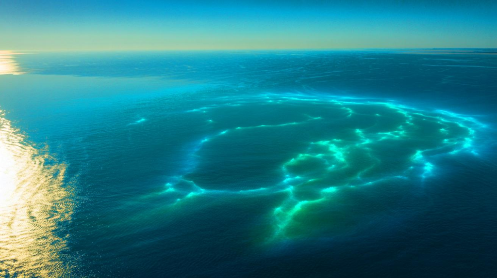 Phytoplankton are microscopic plants that float near the ocean surface and contain chlorophyll a, the green pigment that enables photosynthesis. When present in high concentrations, they reflect light in shades of blue and green, producing a glowing effect that satellites can detect.