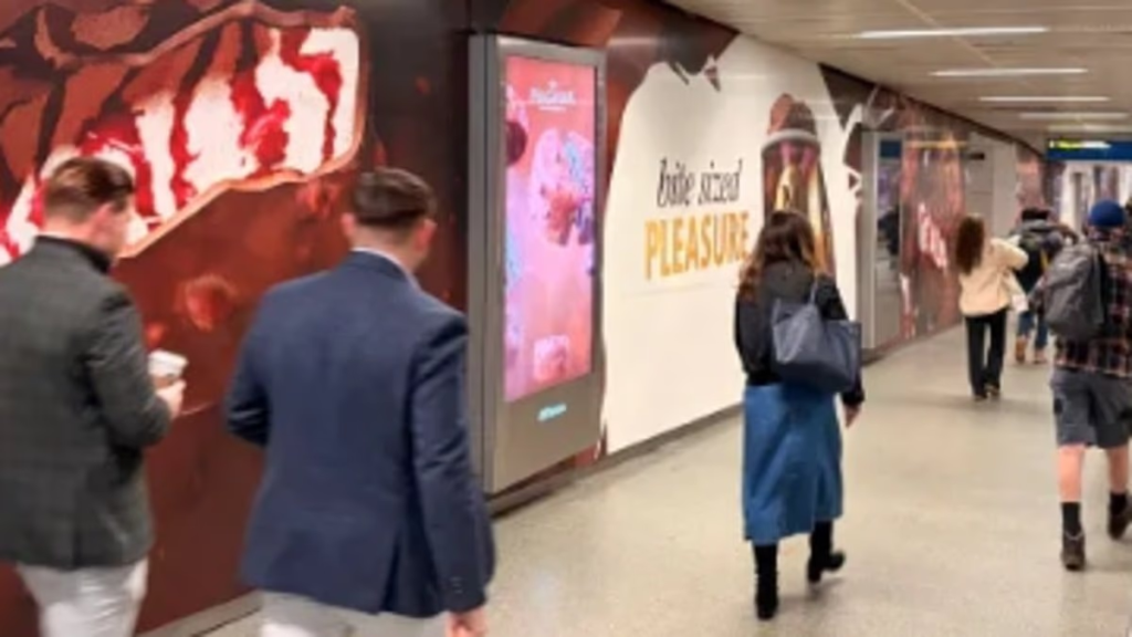 Installed between St Pancras railway station and King’s Cross St Pancras Tube station, the unusual advert combines visuals, sound effects, and scent to recreate the experience of biting into a Magnum ice cream.